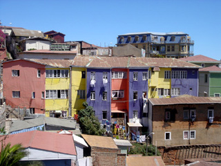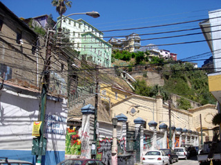 バルパライソのテルミナルから、1キロほど離れた街の中心部に向かって歩き始める。大通りに交差する通りの南を見ると、急斜面にびっしりとカラフルな色合いの四角い家々がひしめいている。大通りのある平地は狭く、すぐ北は太平洋である。