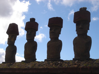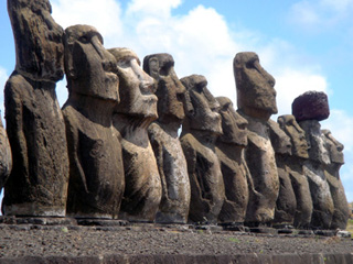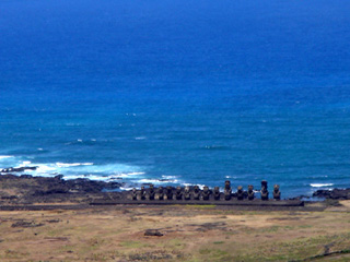 モアイというのは、かつてここの先住民ラパ・ヌイの人々が造ったものである。各部族の権力者一族により、部族の後世での繁栄を願って建てたもので、いずれも村落の方向を向かって、部族を守る守護神として建っていた。つまり、海沿いの村では、すべて海に背を向けて建っていた。一人の首長が死ぬと、一体のモアイが建てられる。そうやって、モアイはアフと呼ばれる祭壇(礎石)上に一体、また一体と建てられていったのである。その大きさは、小さいもので1.13m、最大21.6m。権力の強大だった首長ほどその死後に建てられたモアイは巨大で、生前の権力の大きさがモアイの大きさに比例しているそうである。この小さな島には、大小900体ものモアイが存在する。
