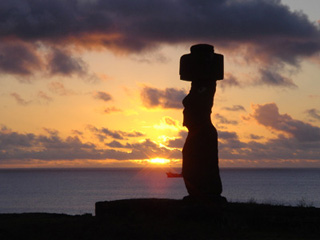 ハンガロア村から程近い、タハイ遺跡がある島の西海岸で、太平洋に沈む夕日を眺める。オレンジ色の背景に、モアイのシルエットが浮かぶ。
