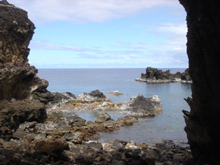 ラノ・カウの火山を目の前にして、アナ・カイ・タンガタにある洞穴を訪ねる。岩がゴロゴロする入り江の奥まったところに、洞穴がぽっかりと口をあけている。ここでは昔、戦って敗れた部族の人間を、儀式として食人していたと言われ、「食人洞窟」と呼ばれている。そんな血なまぐささは感じることはできないが、海に面しているからか、どことなくジメっとした冷気が流れている。そんな話を聞くと、ここでの夜を想像してみるだけでゾッとするが、一方で、満月の夜、入り江の光る海をこの洞穴から眺めたら幻想的で美しいだろうなぁと思う。南の島の満月の夜と海。砂浜もいいが、ゴツゴツした岩々に囲まれた小さな入り江の方が断然美しい。そういう意味では昼間のこの洞穴は味気ない。