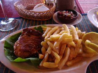 観光客用レストランで夕食を食べる。僕のほかに、日本人若者一人と、日本人の家族連れ(お父さん、お母さん、男の子一人)がいる。家族連れは、昨日も別のレストランで見かけた。『歩き方』を見てこのレストランにやって来たのだろう。日本人の若者は、近くのオバちゃんグループに呼ばれ、一緒に酒を飲み始めた。彼は英語をしゃべっている。オバちゃんたちに酒の肴にされている。あーあー。だけどこれも一つの異文化交流だ。