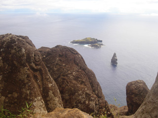 さっきはここから見た風景に対して何も考えられなかったが、今は違う。雨が晴れ、視界が良好な青い太平洋を、山の頂上の崖の上から見渡す。近くに3つの小さな島がある。これらはいずれも無人島で、かつて毎年8〜9月の春の到来とともに、そのうちの一つの島まで泳いで渡り、グンカン鳥の卵を持って帰ってくるという宗教儀式が行われていた。この卵を受け取った上官は、”鳥人”と呼ばれ、以後一年間、全島を治める権利を有したという。ここの岩岩には、鳥の頭を持つ人間、鳥人のレリーフが数多く刻まれている。