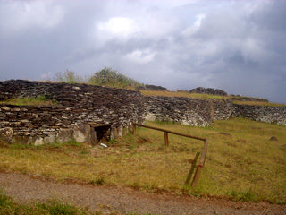 そして、やっと雨は小降りとなった。雨が降り始めてから1時間以上経過している。僕は潅木の下から立ち上がり、フラフラと自転車のところへ向かう。土の道は冠水したように泥水が川のように坂下に流れている。僕はさらに登ってオロンゴの儀式村に行くか、すぐに山を下って村に戻って身体を乾かすか迷ったが、ここまで来たからにはここで引き返すのは辛い。まだ雨が降っている中、また自転車で坂を登り始める。しばらく行くと頂上で、オロンゴのラパ・ヌイ国立公園の事務所にたどり着く。服を着たまま川に入ったかのようないでたちの僕を見るなり、事務所の若い女性は驚いた顔をしたが、すぐに明るい顔で挨拶をする。ここでは入場料を支払って儀式村を見るのだが、彼女は今日は大雨だし、入場料5000ペソはいらないわ、と言って儀式村の入り口を教えてくれた。僕は礼を言う。ここは、オロンゴと呼ばれる聖地で、モアイ時代の後、人々がモアイに変わって信仰した鳥人(鳥人間)を祭る、儀礼の場所だったという。