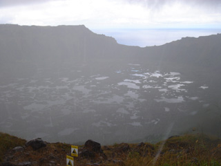 まだ雨は降っている。観光客は誰もいない。僕一人だけ。僕はここで重大なことに気づく。水に寝れたせいだろう、ビデオカメラがウンともスンともいわない。水がカメラ内部に入り込み、電子回路をショートさせてしまったのだろうか。デジカメはまだ生きていて、雨の中儀式村の写真を撮り始めたが、しばらくしてこちらも起動しなくなった。ビデオもカメラもいずれもこの雨にやられてしまったのだ。雨は小降りになったとはいうものの、まだ絶え間なく降り続いている。山の上から、雨の靄に煙る太平洋の広大な大海原が見える。本来であればこの光景は絶対に人々の心を動かすであろうが、この雨で視界が白く遮られているせいと、この雨でもはや機能しなくなっている僕の頭には全く作用しない。海の反対側にはさっきと同じ、雨に煙って水面がもやに覆われている火口湖が見下ろせる。デジカメもビデオも動かなくなった今、僕はすべてを諦めて、事務所に戻り、儀式村を後にする。