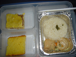 夕食のサービスがある。機内食ならぬ車内食。だがその内容はチンケそのもの。えっ、何これ?状態。プラスティック製の容器に入っているのは、米、鶏肉二切れ、ラザニアみたいな惣菜スナック一つ、スポンジケーキ一切れ(写真)。こんなん1ドルもしないだろう。タイの豪華バスなら、夜中にドライブインで、ビュッフェ形式の食べ放題だよ。違いすぎる。金はかなり払っているのに。
