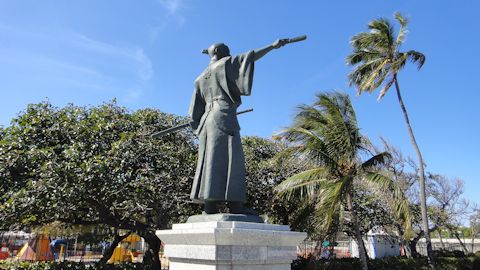 要塞前の運河沿いに、日本人の小さな銅像が建っている。彼は扇子を持って、それを空に指している。この人物は、あの、支倉常長である。なぜここハバナに彼がいるのか?このホームページの読者ならご存知の通り、支倉常長は、慶長遺欧使節として江戸時代に伊達政宗によって派遣された、一介の地侍である。1613年、彼は太平洋を渡ってメキシコに到達、さらにカリブ海経由で大西洋を渡ってスペイン、ローマにたどり着き、ついにはローマ法王パウロ5世との謁見に成功する。そしてキリスト教に改宗して7年後の1620年に日本に帰国するが、折りしも日本はキリシタン禁制となっており、大仕事を成し遂げたにも関わらず、不遇のまま一生を終えたとされる。この数奇な運命をたどった支倉常長は、遠藤周作の小説『侍』に詳しいが、彼は始めてキューバの地を踏んだ日本人として、2001年、ここハバナに記念の銅像が建てられたのである。キューバと日本の友好の印としてこの銅像を寄贈したのは、伊達藩のお膝元、仙台育英学園。