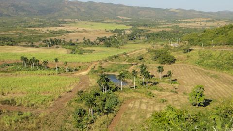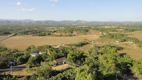 まずは渓谷を見渡せる展望台(ミラドール)へ。トリニダー市内を出ると、景色は遠くに山、近くにサトウキビ畑となる。ここは渓谷状の地形が連なり、その谷の部分には、かつてキューバの糧だったサトウキビ畑が広がっていた。緑豊かな風景を、真っ直ぐな一本道が貫く。ココタクシーはバイクタクシーであるので、60kmくらい出すと、もうエンジンが悲鳴を上げる。それでも50kmくらいで真っ直ぐな道をひたすら進む。