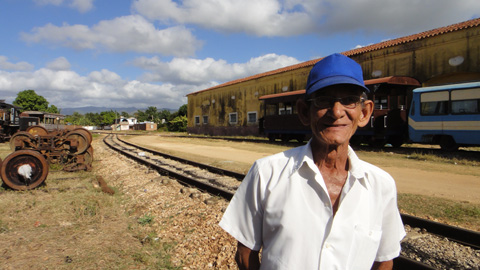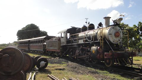 トリニダー駅に向かう。人に道を聞きながら、旧市街の中心から20分ほど歩くと、駅がある。ここには観光用の年代物の蒸気機関車が走っている。これはかつて、トリニダーとイスナガ駅の間をサトウキビを運んでいた機関車。トリニダーの近くには、植民地時代に広大なサトウキビのプランテーションが作られ、多くの奴隷が働いていた。