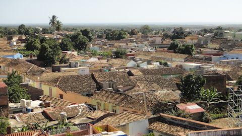 この建物には塔があり、この屋上から見るトリニダーの眺めは格別。キューバの家々の屋根は、茶色の瓦が特徴で、トリニダーは古い街だからか、ここの家の瓦は、様々な茶色が混じっていて、まだら模様に見える。茶色の屋根の広がりの間に、緑の木々が突き出している。