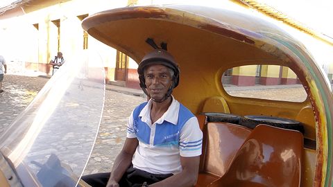 トリニダー郊外、ロス・インヘニオス渓谷には、かつて植民地時代、広大なサトウキビ畑が広がっていた。多数の奴隷が働き、大農園主のイスナガ一家が富をほしいままにしていた。ここに行くのに例のてんとう虫型のココタクシー(トリニダーではこう呼ぶ)を探すが、一台も停まっていない。1時間くらい街角を歩き回るが見つからない。するとようやく客を乗せたココタクシーを見つけ、合図を送る。しばらくすると、客を降ろしたココタクシーが戻ってきてくれた。アイコンタクトのみだったが、よくぞ以心伝心でこちらの意図が伝わったものだ。運転手のおじさんは、50がらみの穏やかそうなおじさん。ミラドールとマナカイスナガの塔に行きたいと告げると、彼は、二人だと20CUC(一人当たり10CUC)だが、一人だと15CUCなのだという。12CUCでは?と食い下がったが結局14CUCまでしか下がらなかった。だが、ここから15kmも離れているので、往復で14なら仕方ない。