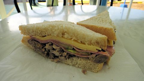 シエンフエゴスに9時に着き、途中、11時、行きにも立ち寄ったドライブインで休憩。僕はサンドイッチ・クリオージョを再び食す。今度のはハンバーガータイプではなく、食パンで挟むサンドイッチタイプ。美味い。