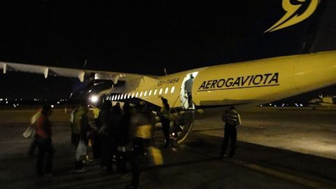 遅延の理由はよく分からなかったが、機体トラブルか整備遅れらしい。ようやくバスは動き出し、乗客が飛行機に乗り込む。小型機だ。わずか42人乗り。満席である。ここの1席を僕が確保できたのは、奇跡のように思えてくる。だがよく見ると、一人のアエロガビオータの係員が席を埋めていた。これは仮説だが、職員分の席を僕のために明け渡したのかもしれない。いずれにせよ、僕の席があることに、改めてセニョール・マートスとアエロカリビアンのヘフェに感謝し、不思議さをかみ締める。