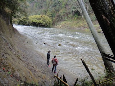 地層の脇を流れる養老川は、雨で増水しているようである。房総の川は、山中では水量が少ないことが多いが、ここの養老川はかなりの流れとなっている。
