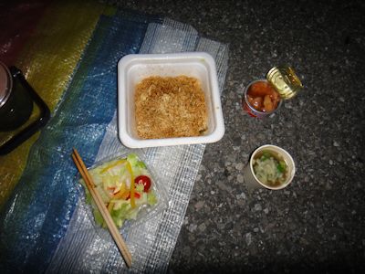 カップ焼きそば、野菜サラダ、鶏の缶詰、みそ汁。暗い国道で自炊。