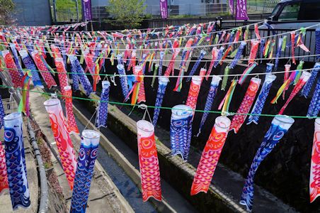 街には、小さな無数の鯉のぼりが水路上にはためいている。