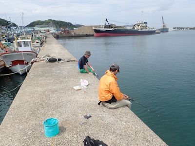 今釣れる魚などの情報を聞き、エサを買い、友人たちは仕掛けを買って浜田港に向かう。