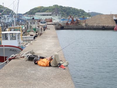 車は多いが、停められるところはあった。堤防は、広い平らな内港側と、高い外海側に分かれていて、それぞれで釣っている人がいる。