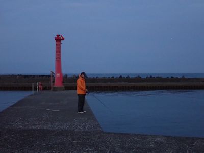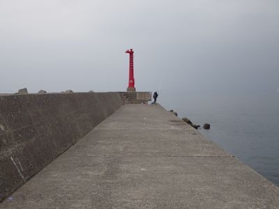 仕方なく、早々に場所を移動することになる。この岸壁の先には釣り人がびっしりで、入る余地はなさそうなので、東側の赤灯のある短い堤防に移る。この堤防は、「西の浜堤防」というらしい。築港堤防は、この北側にある、折れ曲がった長い堤防である。