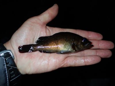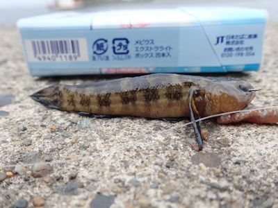 アタリはあるものの、コツコツと小さなアタリだけ。竿を出した後、1時間以内に極小のハゼ(?)が2尾上がる。1匹目は5cmくらいでスレ、2匹目は8cmくらい。すぐにリリース。