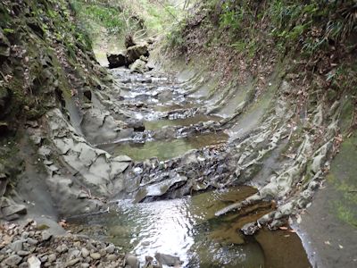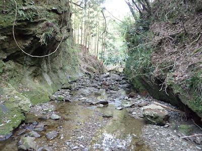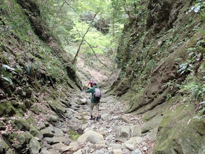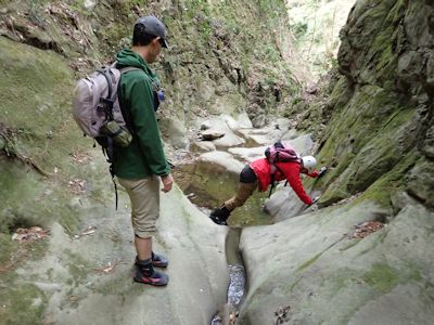 だがここで問題発生。この川は奥井沢ではないのだ。奥井沢ならば南から北に流れているのであるが、この川は北から南に流れている。しかもちょっと下で別の支流と合流し、東に向かっている。要するに、奥井沢の支流であろう。先週の沢登りでこんなところは通っていない。支流同士が合流して東に向かっているので、これが奥井沢に注ぎ込むのだろうと思って沢を降りていく。幸い、水量も少なく、始めは岩があるので水に濡れないで進めた。だが、さらに進むと両壁が迫り、その先はどうやら滝となって落ち込んでいるようであった。このまま沢筋は進めない。