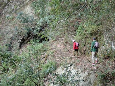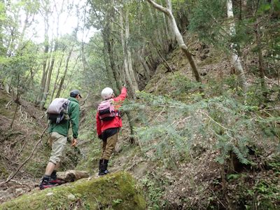 一旦支流に降り、左岸側で傾斜が緩いところを探す。が川を戻ってもかえって手掛かりがない岩壁になるので、超急斜面ではあるが、木や岩角などの出ている斜面を強引に登ることにする。、ここはなかなか緊張した。落ちればタダでは済まない。
