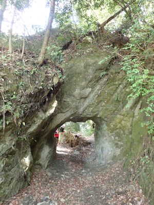 ちょっと上流側にガードレールがあり、そこに例の素掘りのトンネルが掘られている。川から見ると、目の前がトンネルが掘られた岩塊である。
