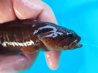 ハオコゼ。腹がオレンジで、長く尖った背びれが毒々しい。