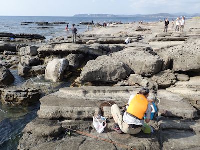 磯では、海中の魚を観察できる船が近くに停泊している。子供たちが網を持って魚などを探し、また釣り竿で釣りをしている。