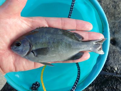 結局、3時間ほど釣って、友人2人はブラクリで全然釣れなかったが、私の釣果は、メジナ2、ギンポ2、カサゴ(またはムラソイ)1、アナハゼ1。