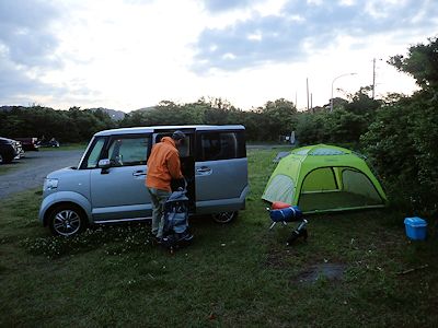 我々は砂浜裏にある小さな駐車場に車を停め、さらに車の後ろの草地にテントを建てた。