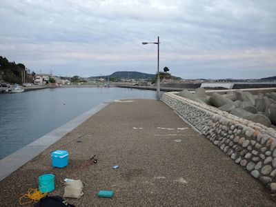 西の浜堤防は幅が狭く、漁船が発着していて、漁師の人たちが作業していたが、釣りは禁止ではないようである。