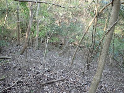 で、東に向かう尾根を回り込む道があったのでここをしばらく行く。すぐに道は不明瞭になり、沢筋地形に出る。ここを下ると沢に出るのだろう。