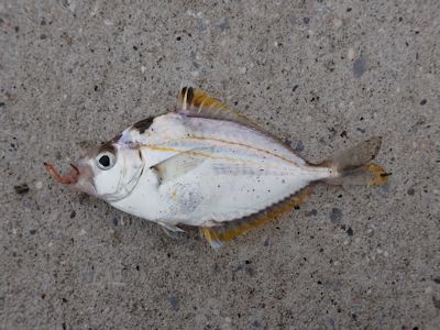 1匹だけ食いついてきた魚が釣れた。小さなヒイラギ。さすがにこれは食べられない。