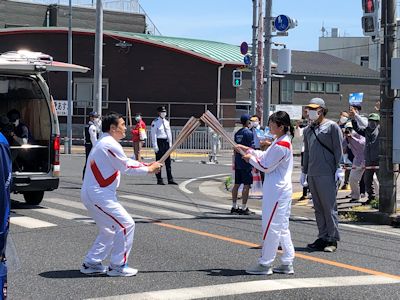 いま走ってきたおじさんランナーとこれから走る女性ランナーが、それぞれトーチを持って向かい合って立ち、男性ランナーのトーチの先に点いている火を、女性の方のトーチの先に近づけて着火させる。