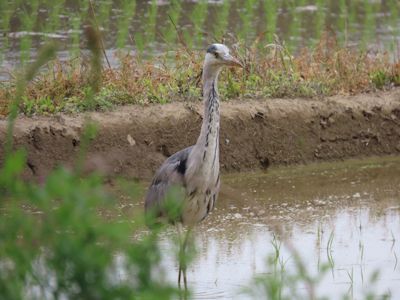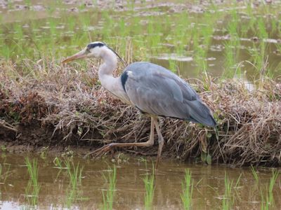 アオサギは、田植えが終わった田の端の方をゆったりと優雅に歩き、頻繁に動きが止まる。どこかをじっと見ている。おそらく、田の泥を凝視しているのだと思う。