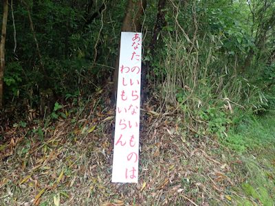 山間の道路に立つ不法廃棄禁止の立て看板(串間市〜日南市間) |