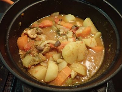 今回は、いつものジャガイモ、ニンジン、玉ねぎ、しめじに加え、もっと水の出る野菜を投入する。