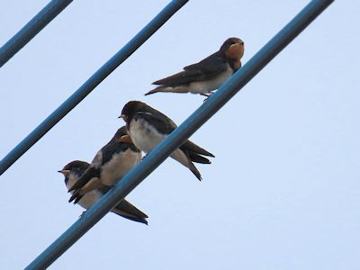 子育て中のツバメの親というのは、ほとんど休むことなく縦横無尽に飛び回って虫を獲っているので、街なかでこのように数羽で休むツバメの姿を見るのは、巣立ちの後であろう。
