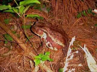 夜中、歯を磨きながら林道に上がろうとしてビックリ、林道に上がる斜面に、巨大なウシガエルがいた。体長は20cm、幅10cmの堂々たる大カエル。夜行性なのか、飯を食うために動き始めたところだろうか。