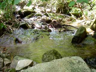 午後2時半。昼食。小浜名物・鯖の缶詰、ご飯(うまく炊けた)、味噌汁、りんご。我ながら美味かった。食後、川に足だけ入る。渓流で川幅はせいぜい2、3メートル、深さは深いところでも30cmほど。ひゃっこい。冷たすぎ。渓流の清冽な冷水。