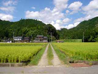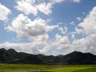 国道175号は、ゆったりとした流れを湛える由良川沿いを走る。のどかな田園と緑の山並みを、真夏の空の青さと雲の白さが一層引き立てている。これが美しい日本の夏の風情。