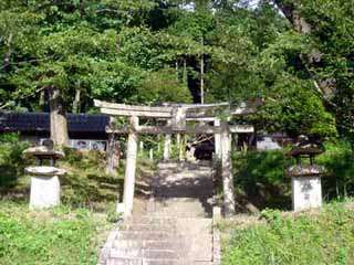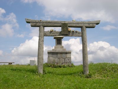 山頂は、不思議な空間だった。森の中を抜けると、そこは雲がすぐ近く頭上を流れ、広々とした緑の丘だった。青い空に白い雲が速く流れる。山頂部分は木が切られ、こんもりとした更地となっていて、社が立てられ、神が祭られている。鳥居、棒状の碑、社、それらが雲をバックに、緑の芝生にぽつねんとして建っている。頭上には青い空と白い雲。うっそうとした森の中から、突然開けた場所に、もう長い間手付かずのような人工物が建っている。何年も人が入っていない場所に、久しぶりにさまよいこんだ感じ。空と雲と鳥居たちはそこに変わらず存在していたけれども、今まで何年も人の目にさらされていなかったような感覚。
