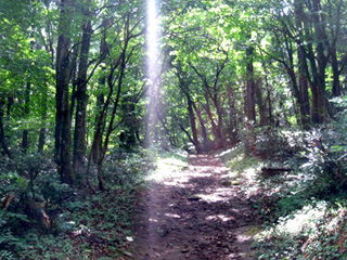 高い梢が頭の上を覆う。空は、木々に遮られ、ほとんど見えない。森の中には植物が作った清涼な空気が流れている。日が現れると、木々の間の空から光が筋となって森の中に降り注ぐ。太陽は、雲に隠れたり雲から出たりを繰り返す。その度に森の中の調光が変わる。