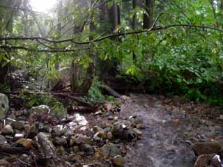 ラジオを聞いていると、島根県地方は午後から雨だというので、雨になる前に、船通山へ登ってみることにした。午前11時20分、登山口を出発。登山口の標高は720m、1142mの山頂まで2.6kmの道のり。登山道は、森の中、澄んだ渓流に沿って続いている。途中、川の上の木の小橋とか飛び石とかで川を向こうに渡ったりこっちに戻ったりし、道は川と絡み合うように登っていく。川の音がシャワーのようにずっと森の中に響いている。