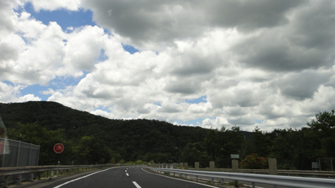 さらに走り続け、広島県を横断。日は高く上った。空には夏の風物詩、雲が綿々と連なっている。その形、つながり、配置展開が面白くて、運転しながらシャッターを切りまくる。青い空に造形された浮遊物。考えるに、夏の雲が面白いと思うのは、くっきりと輪郭を持った形になるからだ。ぼやっと流れるような雲は、夏の青空にはあまり浮かんでいない。それと、比較的低い位置に浮かぶこともあるだろう。だが、秋の高い筋雲やいわし雲も、それはそれで感じるものがある。夕日で赤く染まってたりすれば絶妙だ。季節の雲を感じるのも、四季のある日本ならではだろう。