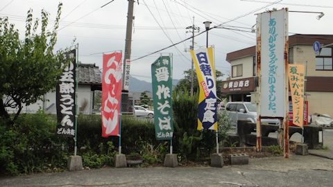 隣の食堂の前にはのぼりが立っていて、「晋作そば」に「小五郎うどん」。そりゃ、そうでしょう。それにしてもどんなそばとうどんだろうか。まるで見当がつかない。