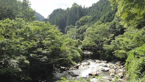 だが、10時過ぎ、雨は止んだ。この隙を突いて、木谷峡を歩くことにする。木谷川は、清冽な清流だ。この辺りは、壇ノ浦の合戦に敗れた平家の落ち武者が住み着いたところで、山を登っていくと、平家屋敷跡がある。途中、平家が捕らえ人質となった源氏方の姫と現地の若者とが逢引していたという「姫岩」とか、鹿も転落するほどの急な崖を伝って流れ落ちる「鹿落ちの滝」とか、歴史と伝説が育んだ、昔の人々の風情を反映した見所が点在している。深緑の森は深い。800年前、平家の皆さんがどのような思いでこの景色を見たのか、当時この川の流れは、今よりも断然美しかったのだろうか。