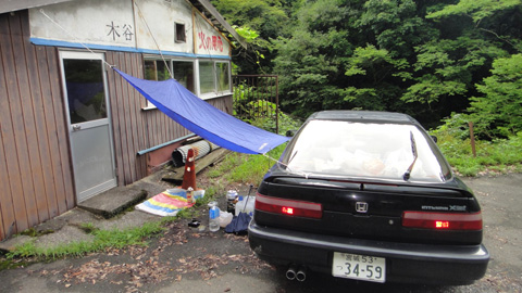 なんとかバンとすれ違い、さらに登る。雨が激しくなる。途中からもう普通車では上がれないような狭くて未舗装の道となった。川沿いにテントを張りたかったが、テントが張れそうな平地はなく、林道から川へは結構落差があり、川へ降りるのも一苦労だ。もっと山奥の人がいなそうなところがよかったが、仕方なく少し道を下って、小さな神社の横の広場に野営することにした。川は下にあるが、降りられない。これまた軟弱であるが、神社にも近くの無人の山小屋にも水道があったので、ここから水をもらうことにする。雨はますます激しくなってきたので、今日はテントを張れそうにない。仕方なく、車を小屋に横付けして、車と小屋の間にフライシートを張り、この下で炊事することにする。