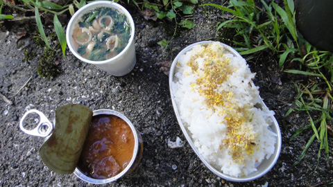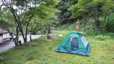 朝10時過ぎにようやく車から起き出す。朝の天気はまずまずだ。ここ二日、身体を伸ばして寝ていないせいか、雨上がりの爽やかさはいまひとつ。神社にお参りし、水道で顔を洗う。昨晩炊いたご飯で朝食後、早速広場にテントを建てる。