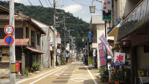 台風一過の晴天。山を下り、再び錦町へ。「氷」、「アイスクリーム」、「冷麺」ののぼりが、夏の風情をよく出している。